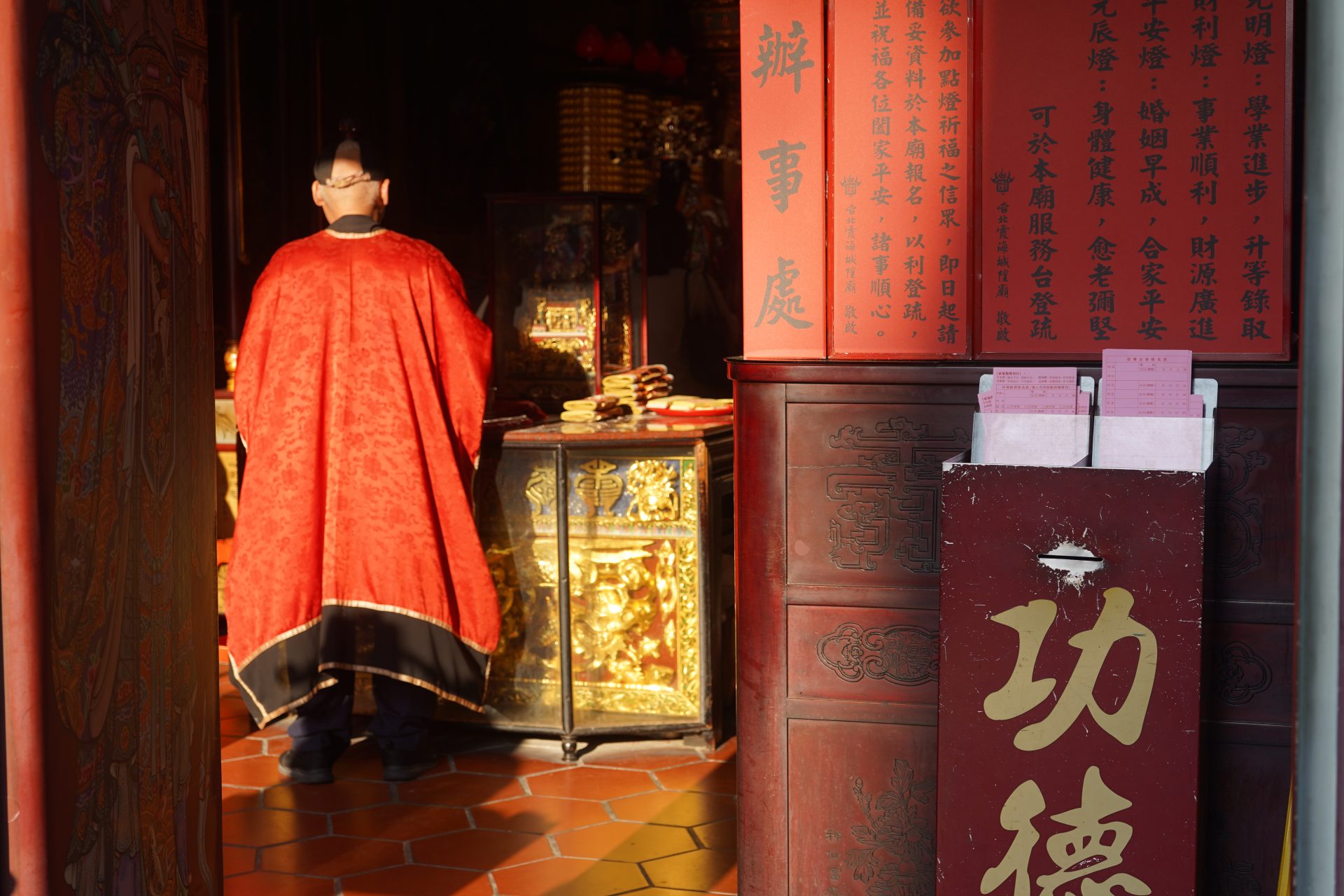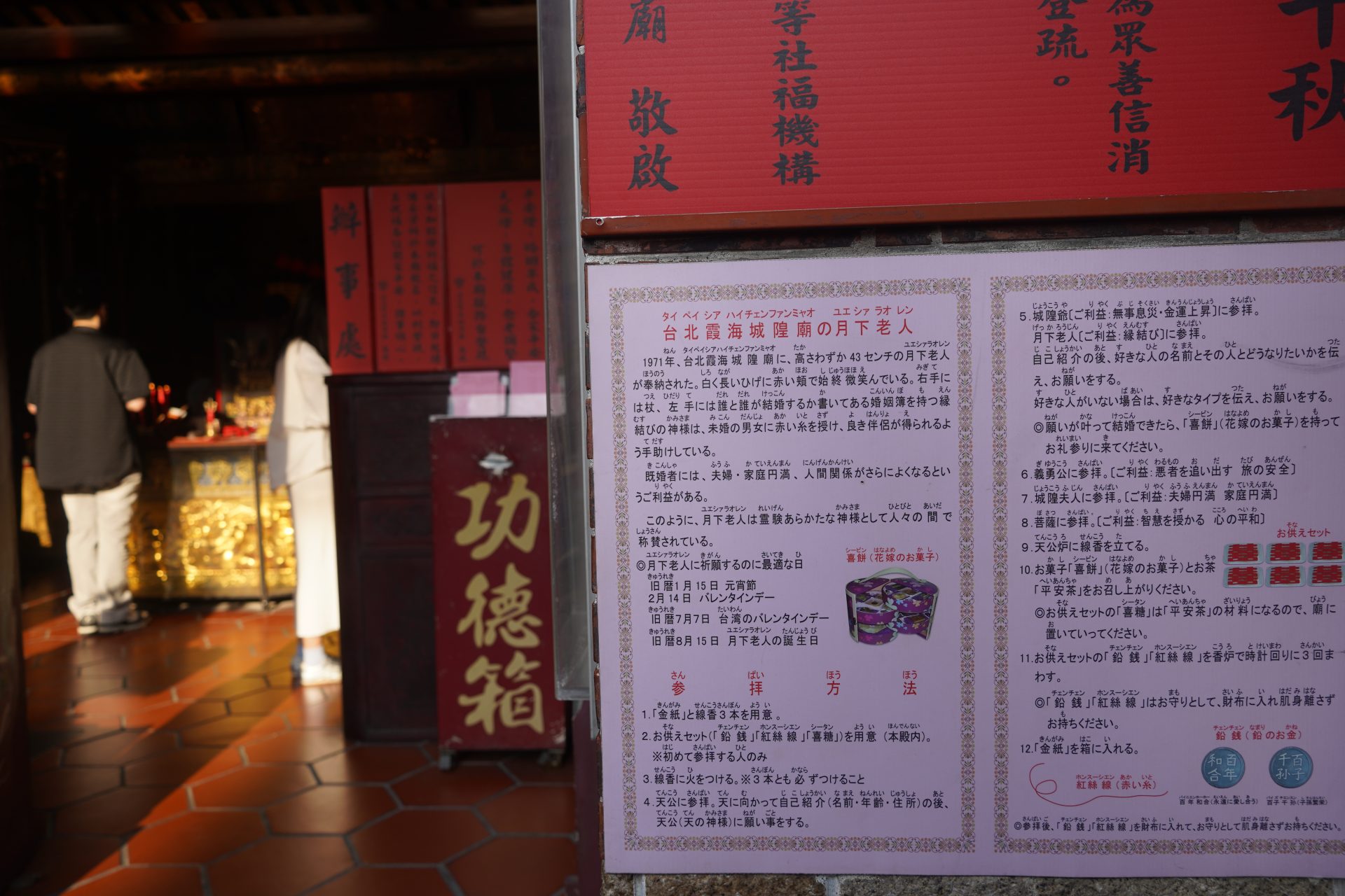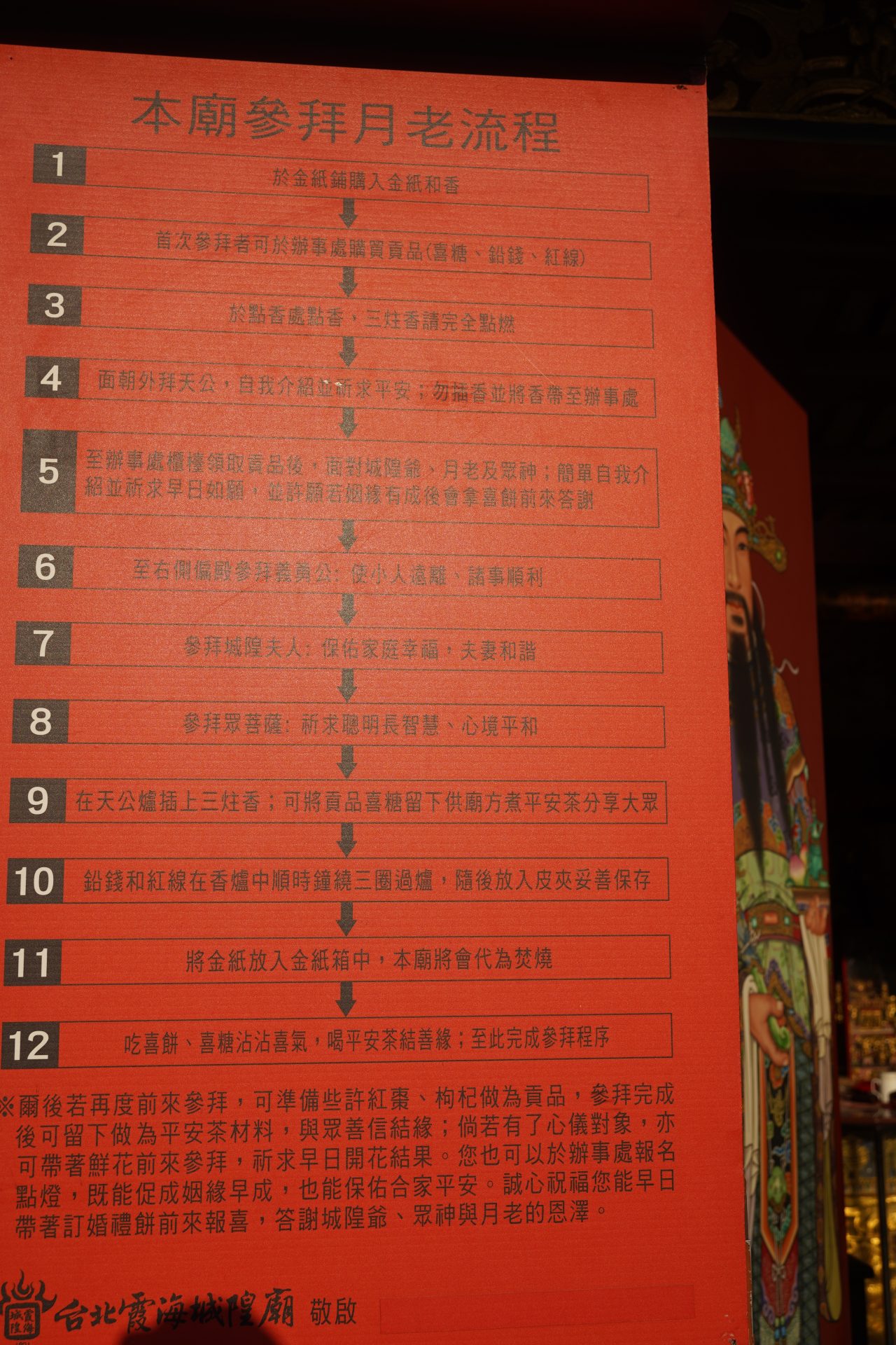 台北心靈圖鑑之三:大稻埕霞海城隍廟——都會迷宮裡的幸福診斷室 Post author:veins_of_taipei Post category:空間的故事 圖/文:江晨 你可能不會料到,台北大稻埕霞海城隍廟裡的供桌上,竟然有信眾供奉的「紅帽子」喜餅。 如果說大龍峒孔廟是教人「留白」的靜心之所,行天宮是追求「秩序」的能量磁場,那麼隱身在迪化街繁華商貿中心的霞海城隍廟,或許就是台北這座城市裡最充滿煙火氣、也最懂現代人寂寞的「幸福診斷室」。 民間傳說中,這裡的月老非常靈驗,經常有被牽線成功的人,回來還願,並分享喜餅。 從海邊拓墾到商貿核心的駐足 霞海城隍廟的歷史,本身就是一場關於信仰隨商貿遷移的時空旅程。這座廟宇僅約 46 坪,在空間尺度上與孔廟的宏大復雜形成鮮明對比,卻承載了全台北最高密度的香火。身為城池的守護神,城隍爺見證了大稻埕從清代茶葉外銷的黃金時代,到位移至今日文創與傳統乾貨並存的歷史街區,祂始終在那裡,守護著這片土地的靈魂。 城隍一詞原意為「城牆」與「護城河」,好比是城市守護者。在信仰意義上,祂是冥界的行政首長與司法官。城隍爺負責保佑城市的安寧,在大稻埕的歷史脈絡中,祂見證了從清代海邊拓墾到繁華商貿中心的轉遷,守護著這片土地的秩序。祂具備神界的司法職權,負責記錄凡間的善惡,並在冥界進行審判,這種公正無私的形象,為信眾提供了強大的道德依託。 月老紅線與現代靈魂的深度對話 霞海城隍廟最成功之處,在於它讓古老神祇與現代靈魂產生了強烈的共鳴。在這裡,我們看見了「新與舊」最溫柔的對話:年輕的信眾帶著現代的擇偶標準,前來尋求古老月下老人的紅線。月老不僅是姻緣的座標,更是將縹緲的願望物化為一條具備掌控感的「紅線」,讓古老的信仰在當代生活中精準落地。 霞海城隍廟,其歷史背景不僅是一段宗教移民史,更是一部台北城市的開拓史。這座廟宇之所以靈驗,或許也與它歷經戰亂、守護族群的強悍生命力有關。 回溯歷史會發現,霞海城隍廟信仰的源頭與台灣作為移民社會的屬性息息相關。霞海城隍爺原是福建泉州府同安縣下店鄉(今廈門市內)的守護神。清道光元年(1821 年):信眾陳浩然帶著家鄉的城隍爺金身渡海來台,最初供奉於艋舺(今萬華)的八甲庄。1853 年爆發了著名的「頂郊」與「下郊」衝突。 當時同安人(下郊)戰敗,為了保護城隍爺神像,信眾在混戰中冒死突圍,甚至有多位護神壯士犧牲。逃離艋舺後,同安人帶著神像來到當時仍是荒地的大稻埕。 傳說廟址位於「雞母穴」,是一個能帶來繁榮與守護的吉地。在大稻埕富商與信眾的集資下,1859 年這座廟宇於現址落成。由於紀念家鄉的「霞城」與「海邊」,故名「霞海」。 如果去現場,會發現主神城隍爺並不像一般廟宇般巨大。這是因為當年從大陸渡海而來,為了方便攜帶與在戰亂中搶救,神像必須設計成精簡的尺寸。雖然神像不大,但在信眾心中,這種「濃縮」的神力更顯精悍且靈驗。廟內側殿供奉著「義勇公」,他們就是當年「頂下郊拚」中,為了保護城隍爺神像而犧牲的 38 位壯士。這也賦予了這座廟一種「忠義」與「有求必應」的強烈色彩。 霞海城隍廟最初是以「城隍爺」的威嚴與司法職能著稱。月老信仰是在 1971 年後才逐漸成為主流。當時一位老太太為了感謝城隍爺保佑孩子平安長大,想為孩子求得好姻緣,便捐獻了一尊月下老人神像。隨著大稻埕商業繁榮,往來商人多,求姻緣、求貴人的需求日益增加,月老的靈驗口碑才逐漸蓋過了城隍爺的威嚴形象。 迪化街最韌性的社群客廳,都會迷宮裡的幸福處方 城隍廟是真正意義上由眾人參與、管理與共享的場域。它反映了民間意志對文化的守護,更是大稻埕商人的精神領袖。每年的「五月十三迎城隍」祭典,將整條街區轉化為龐大的公共廣場;而日常門口的茶水服務與周邊店家的緊密連結,讓它不只是神壇,更是鄰里與觀光客共享的文化客廳。 對於在快速節奏的台北生活中感到孤獨或迷惘的人而言,霞海城隍廟提供了最即時的心靈慰藉。透過求紅線、拜月老的儀式,人們獲得了一種對未來幸福的掌控感與安定感。在快節奏的迪化街,跨入城隍廟的那一刻,人們能將生活的委屈與期盼託付給城隍爺與月老,完成一次情緒的排毒與釋放。 霞海城隍廟月老之所以被公認為「全台最靈驗」之一,除了信仰的神蹟感應外,其實還包含了深厚的歷史背景、效率至上的台北生活步調,以及極具人情味的民俗特色。 不同於大型廟宇,霞海城隍廟規模雖小,但信眾普遍認為這裡的月老辦事極有效率。有一種說法是,城隍爺掌管陰陽兩界的司法事務,麾下的月老也沾染了「公事公辦、絕不拖拉」的風格。對於生活節奏快速的台北人來說,這種「速戰速決」的靈驗傳說非常契合都市需求。 在民俗觀點中,霞海月老的執掌非常細膩。除了幫單身者牽紅線,許多信眾也會帶著另一半來祈求感情穩固。更有趣的是,這裡的月老被認為具有「過濾」功能,能協助斬斷不合適的孽緣,讓「正緣」能順利出現。 信眾準備的供品通常含有深刻的文化寓意。紅線象徵牽姻緣。鉛錢(台語諧音「緣金」)祈求有緣。紅棗:象徵「早」日達成。枸杞:象徵「顧」好自己,看清對象。 數據是最有力的說服力。廟方曾統計過,每年有數千對甚至上萬對新人前來還願(贈送喜餅)。這種強大的「口碑行銷」在社群媒體與觀光客之